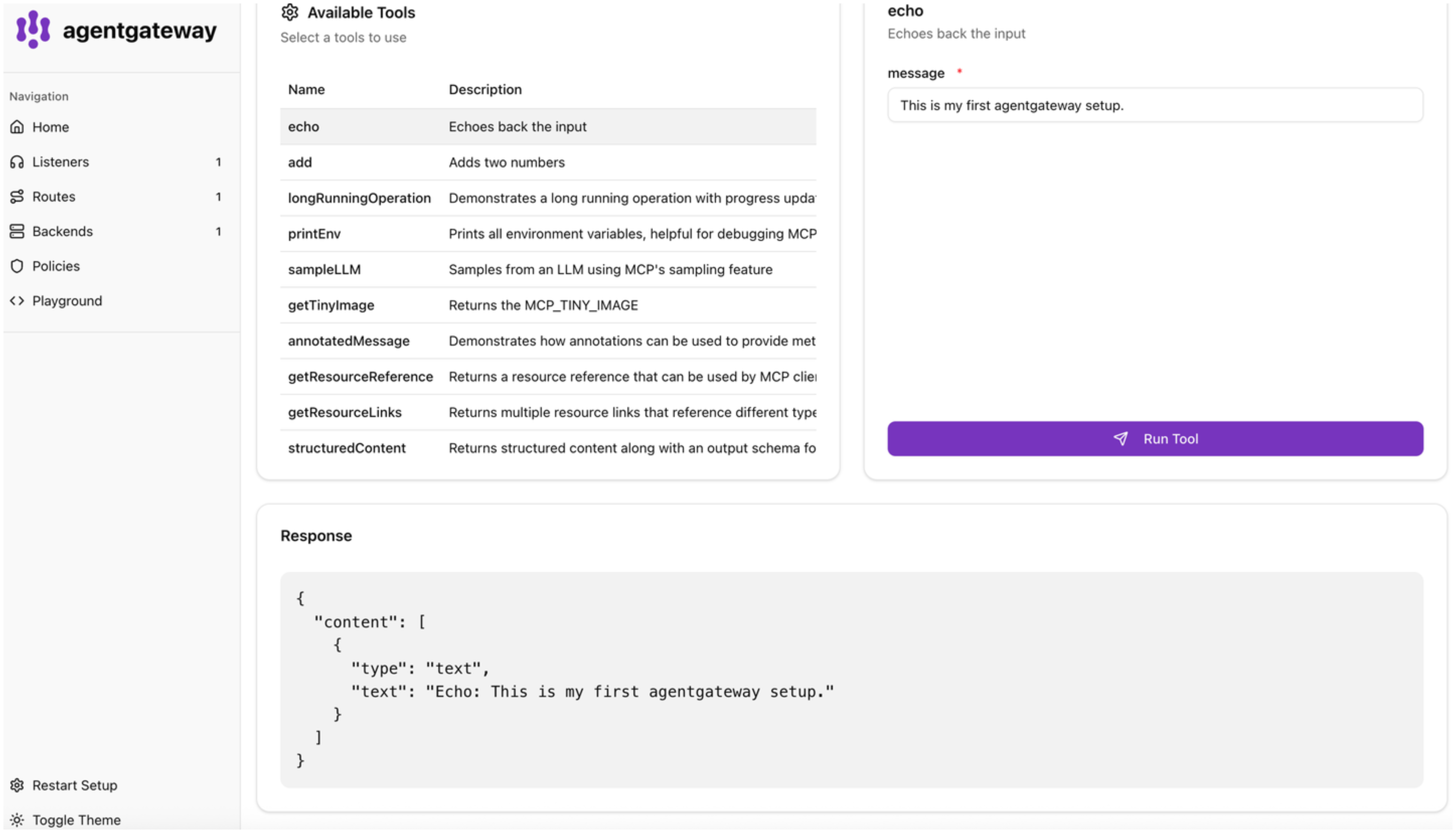 2. In the message field, enter any string, such as This is my first agentgateway setup., and click Run Tool.